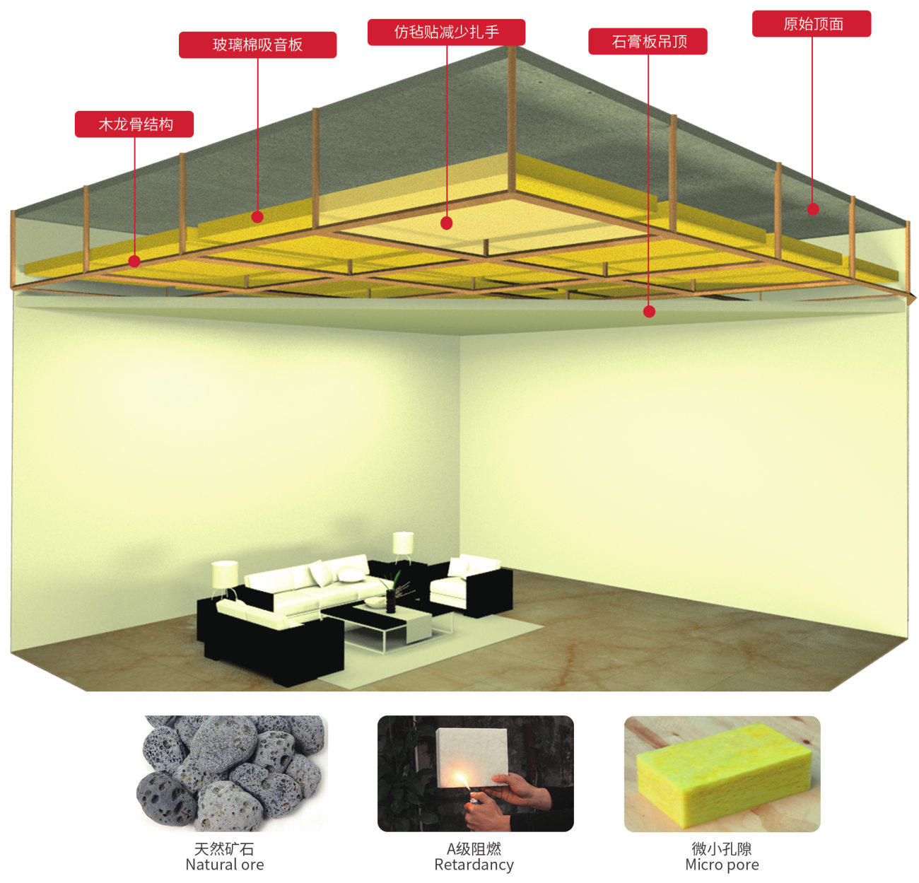 赢胜®天花板隔音隔热棉属于多孔吸声材料,具有良好的吸声性能,可用于各种高档商业建筑天花吊顶吸声降噪,防止冷凝结露,节约能耗。