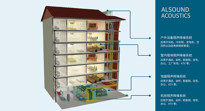 According to different noise sources and different application sites, winsheng has designed and developed outdoor equipment sound and noise reduction system, indoor wall sound and noise reduction system, ground sound and noise reduction system and machine room sound and noise reduction system respectively to solve the noise problems of civil buildings.
